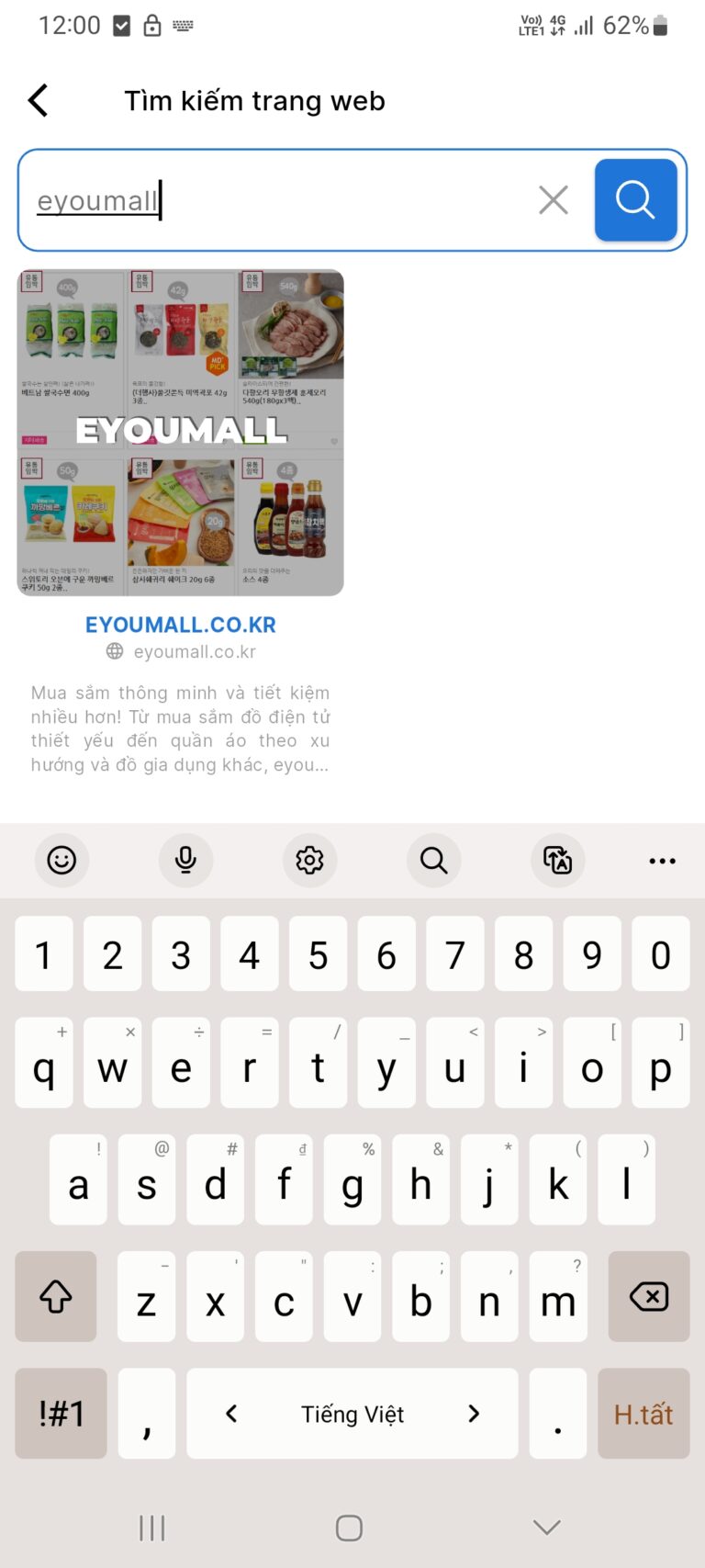 Nhấn vào biểu tượng kính lúp và bạn gõ trên thanh tìm kiếm trang web “EYOUMALL” và nhấn biểu tượng kính lúp sẽ xuất hiện trang EYOUMALL đã liên kết.