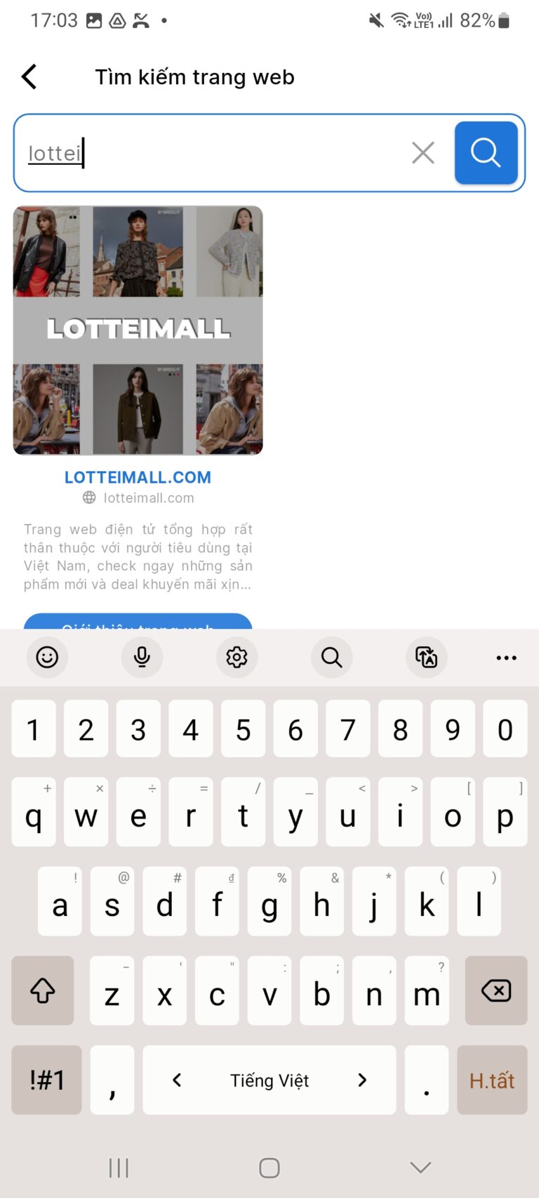 Nhấn vào biểu tượng kính lúp và bạn gõ trên thanh tìm kiếm trang web “LOTTE IN MALL” và nhấn biểu tượng kính lúp sẽ xuất hiện trang LOTTE IN MALL đã liên kết.