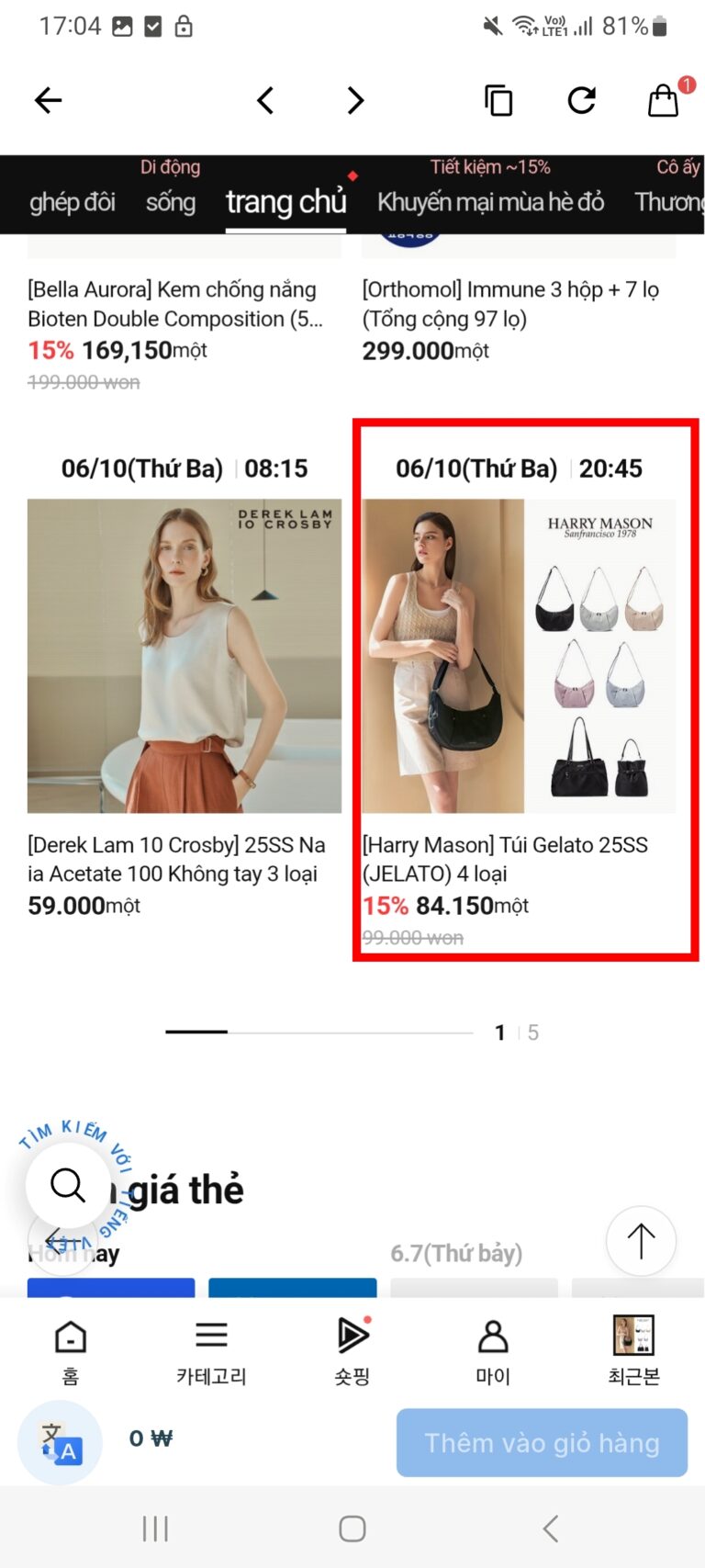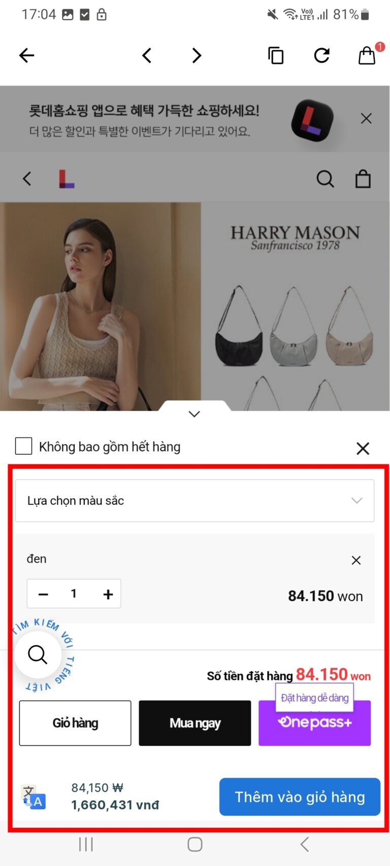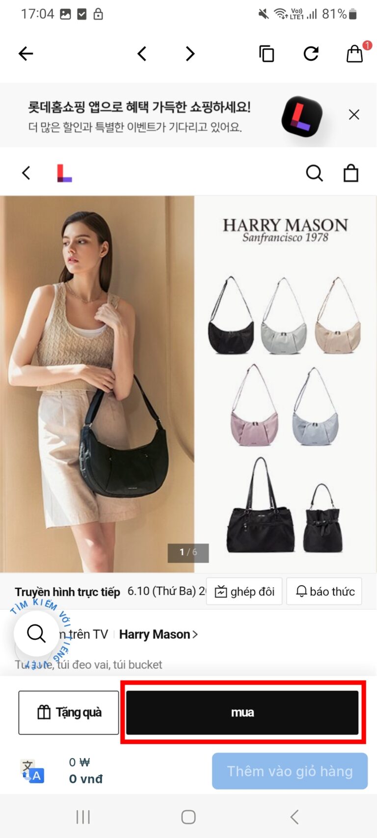 Bước 3: Tại trang của LOTTE IN MALL, bạn lướt chọn sản phẩm bạn muốn mua, ví dụ như admin muốn mua túi xách này, mình sẽ nhấn vào hình sản phẩm đó và làm theo từng bước nhé!