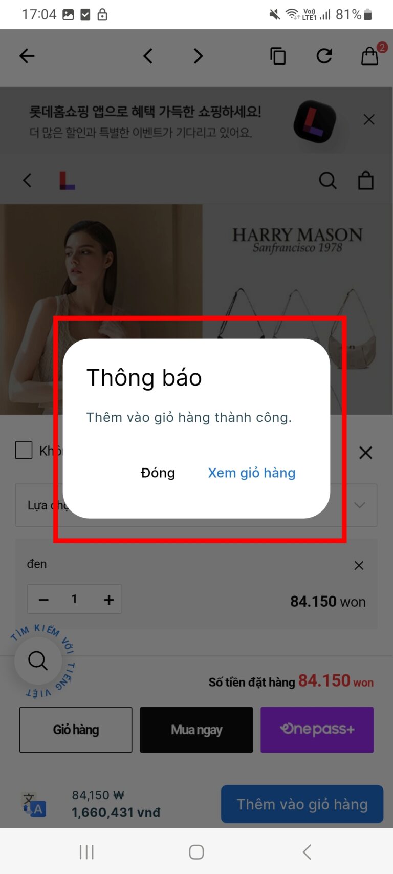 Khi hiện lên khung Thông báo nhỏ, bạn nhấn Xem giỏ hàng để đến trang thanh toán hoặc nhấn Đóng để tiếp tục mua sản phẩm khác (đừng lo lúc này túi xách Harry Mason đã có trong giỏ hàng của app rồi)