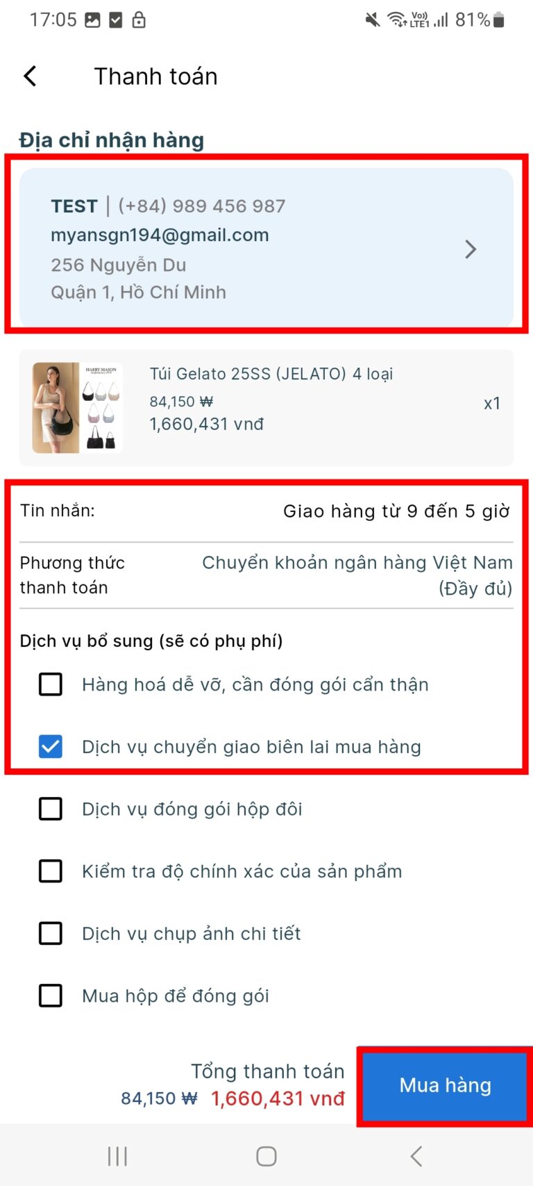 Ở trang Thanh Toán, mình điền địa chỉ, tên, số điện thoại của người nhận hàng. Mình muốn giao từ 9 giờ đến 5 giờ nên sẽ ghi lại tin nhắn. Rồi mình muốn nhận biên lai mua hàng nên nhấn chọn luôn nè. Xong mình chọn Chuyển khoản ngân hàng Việt Nam (đầy đủ) để trả phí sản phẩm và cuối cùng mình nhấn Mua hàng.